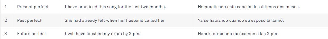 Para finalizar con los present participles, hay otra forma gramatical llamada gerundio que se parece al participio presente. La diferencia entre estos dos es que el gerundio se utiliza como sustantivo y el participio presente no.A continuación, unos ejemplos del uso de los past participles en los tiempos perfectos: