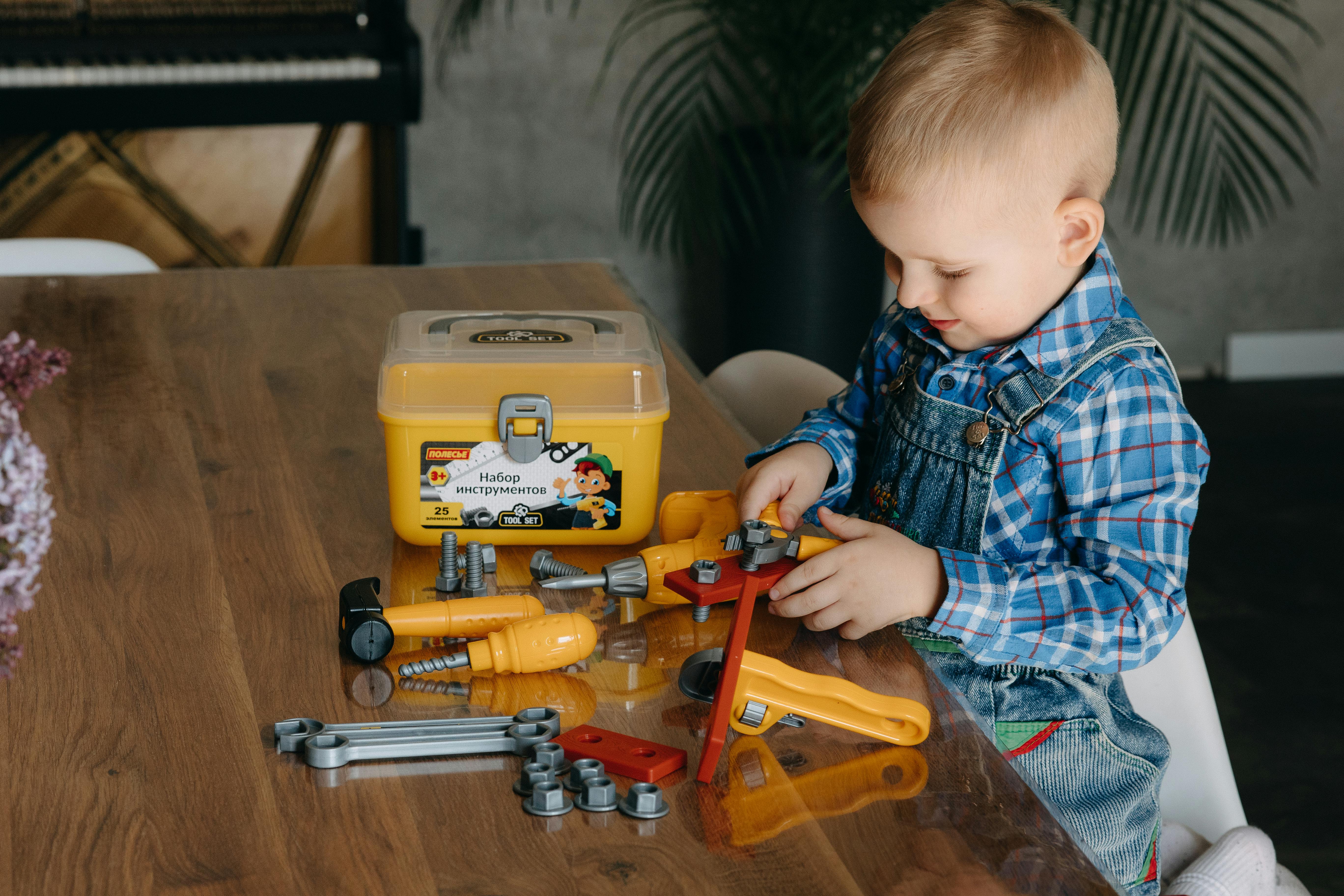 Un niño jugando con herramientas de constructor.