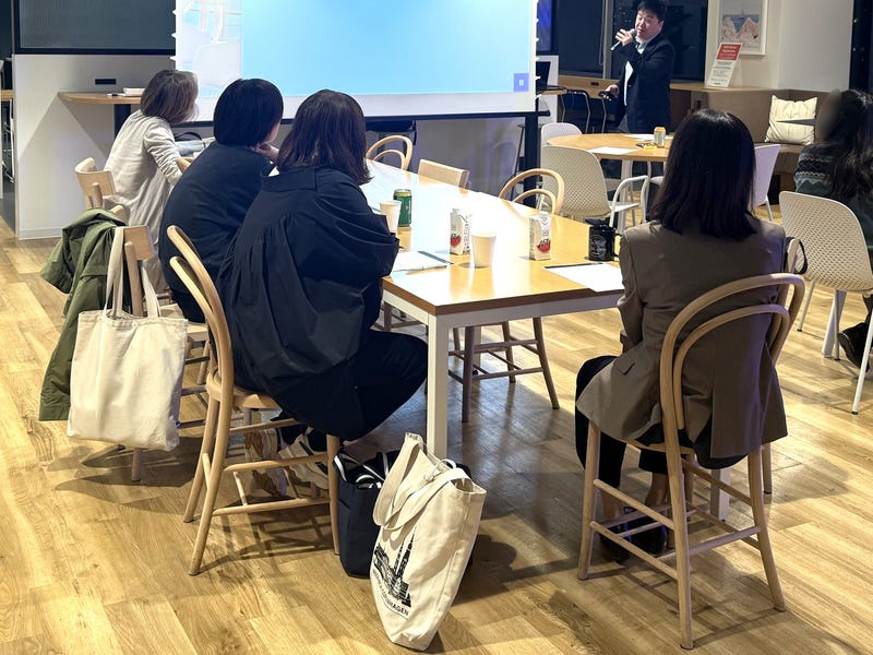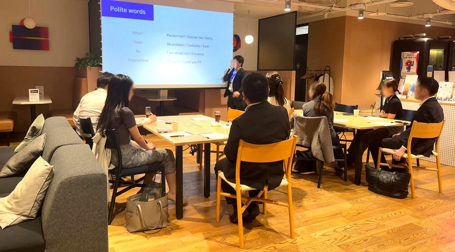東京駅すぐのアクセス抜群なロケーションに、約10名の参加者が集まりました。洗練されたWeWorkのラウンジスペースにリラックスした空気が流れ、まさに“構えずに学べる英語”のスタートにぴったりの空間となりました。